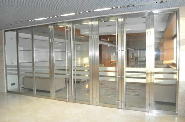 Противопожарные перегородки с дверным блоком могут изготавливаться как в полностью остекленном варианте, так и в частично остекленном исполнении. Основное предназначение таких конструкций — это разделение общего помещения на несколько отдельных рабочих зон. При этом преследуется несколько целей: